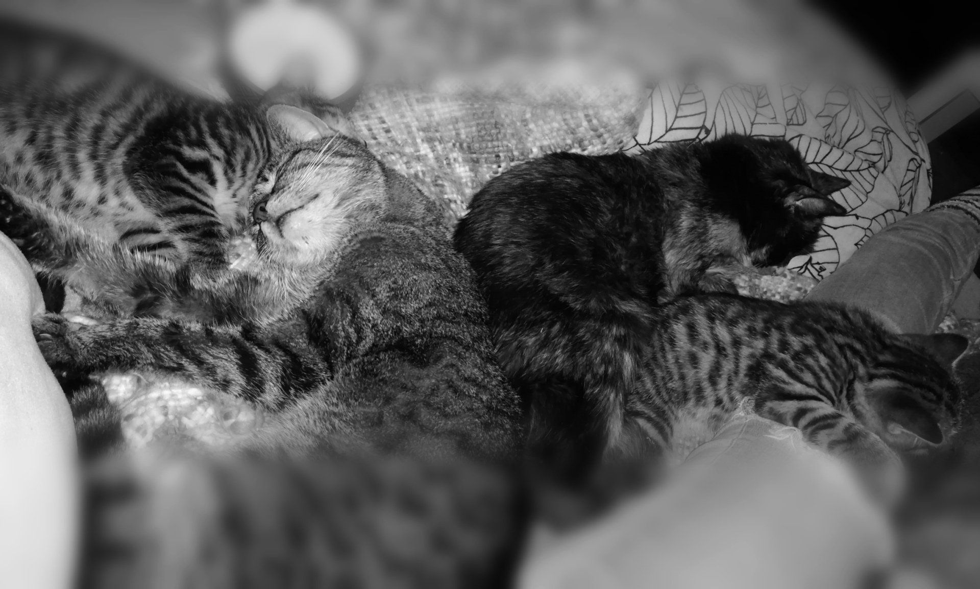 Aber die Dosenöffnerin liebt Herausforderungen und spürte auch schon eine Verbindung zu dieser Katze. Aber was wird aus ihren zwei Freunden? Drei neue Katzen einem trauenden einsamen Kater vorzustellen wäre einfach zuviel für Tiger gewesen. So entschloss sich Tigers Mama Nicky mitzunehmen. Nicky lebte die ersten 3 Tage im Schlafzimmerschrank, konnte diesen aber natürlich verlassen. Nach ein paar Tagen erkundete Nicky ihr neues zu Hause und sie traf auf Tiger und es kam wie es kommen musste. Nicky erhob Anspruch auf ihr neues Zuhause, auf Futter, Streicheleinheiten und die Aufmerksamkeit Ihres Frauchens. Sie ging auf Tiger los und verprügelte ihn bei jeder Möglichkeit. Für Tiger war das nicht leicht, er hatte schon zwei Freunde verloren und jetzt kommt wieder so eine die ihn hier vertreiben will. Tiger ertrug es und schließlich gingen die beiden sich größten Teils aus dem Weg. Es kamen Zweifel auf, ob das doch die falsche Entscheidung war. Nach einigen Monaten zeichnete es sich ab, dass sich beide zwar nicht lieben, aber sie sich akzeptieren und nebeneinander quasi Co existieren können. Nicky kratzte auch ab und an das kleine Menschenmädchen, wenn sie es streicheln wollte. Sonst war sie die verschmusteste Katze der Welt. Auch wenn man sie drei mal vom Schoss nahm, weil man keine Zeit hatte, kam sie wieder und forderte ihre Streicheleinheiten ein! Konsequent! Mit der Zeit war sie auch nicht mehr auf das Menschenkind eifersüchtig, das gelernt hatte, die Katze nur zu streicheln, wenn sie von selber kam. Dadurch hat Nicky gelernt, dass das Mädchen keine Gefahr darstellt und sogar eine treue Begleiterin, Spielfreundin sein kann. Nach etwa einem Jahr verspürte Frau Dosenöffner ein Déjà-vu. Sie kam nach Hause und sah Nicky und Tiger eingekuschelt auf dem Sofa liegen. Wie damals auch Garfield und Baghira. Seit diesem Tag sind die beiden kaum noch auseinander zubringen.